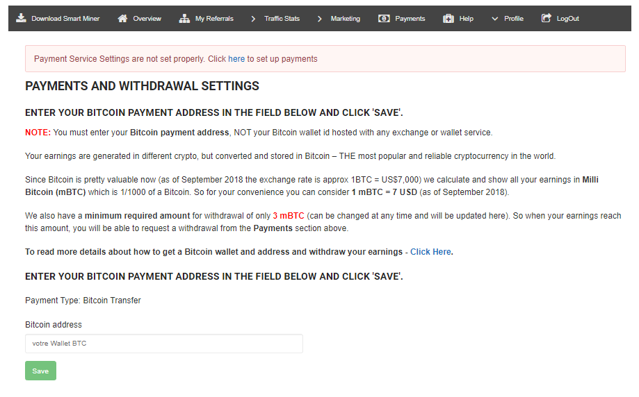 Pour obtenir vos gains, il est nécessaire d’aller dans l’onglet Paiements. Ensuite, il vous faut remplir le champ Bitcoin address avec votre portefeuille BTC. Il est nécessaire de préciser qu’il faut minimums 3 mbtc, soit environ 30$ pour faire une demande de retrait.